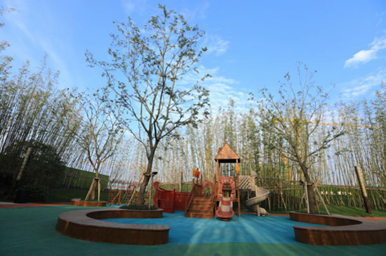 时代城在承接传统民居文化的核心要素的同时,充分运用现代手法,将传统生活的审美意境与现代生活方式实现有机结合。材料方面,因尚诺户外竹材密度高,尺寸稳定性强且环保安全,被大量的用在长廊、休闲椅、景观小品等区域。